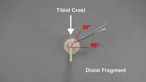 - For the distal fragment, the drill trajectory angles of both Schanz screws should be between 30°-90° relative to the tibial crest.