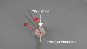 - For the proximal fragment, the drill trajectory angles of both Schanz screws should be between 20°-60° relative to the tibial crest.