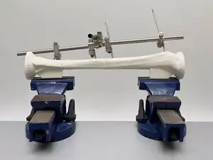 - Take an overhead ("bird's eye view") photo of the cross-section of the distal fragment to record the drill trajectory angles relative to the tibial crest. Check that the center vertical black line of the protractor is lined up with the center of the vise attachment in the overhead photo.