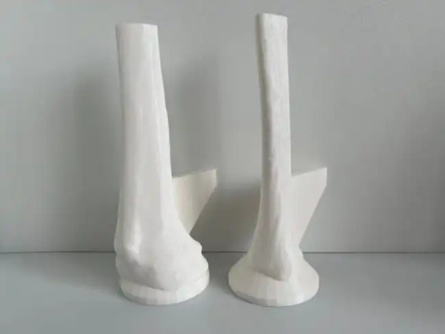For the Tibial Shaft Transverse Fracture Simulator, the 3D Printed Adult Tibial Bone Model 1 (left) is the proximal fragment, and the 3D Printed Adult Tibial Bone Model 2 (right) is the distal fragment.
