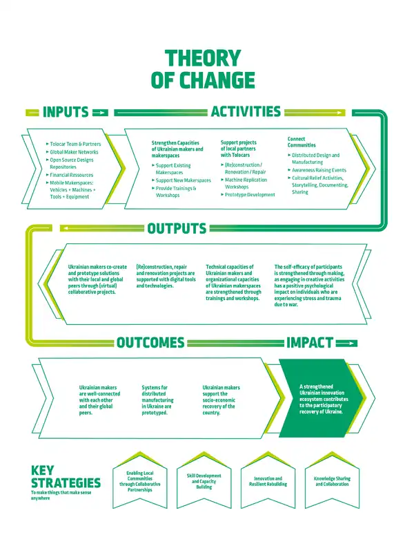 The Tolocar project aims to support both emergency relief activities and the development of a participatory innovation ecosystem for the socio-economic recovery of Ukraine. To achieve this, the project connects communities within Ukraine and globally, so that they can engage in distributed design and manufacturing activities. These connections are only made possible through collaboration among various partners who support the project. The Tolorcar project is funded by the German Federal Ministry for Economic Cooperation and Development (BMZ) and implemented by the Deutsche Gesellschaft für internationale Zusammenarbeit (GIZ) GmbH.