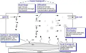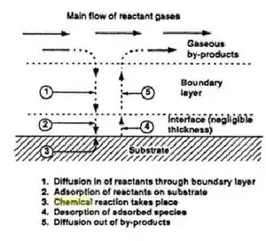 Ionized reactive gas are forced to interact with the substrate and deposit films through chemical reactions. The type of reaction is defendant on chosen materials. The precursor comes into contact with the substrate and absorption of material on the surface occurs. The gas simultaneously diffuses through the boundary layer and decomposition of precursor molecules occurs and converts into a solid film.[5]