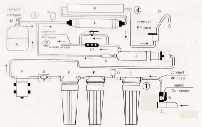 | R. | Mineral ball filter + alkaline filter | 1, 2, 3, 4 | Connect plastic hose |