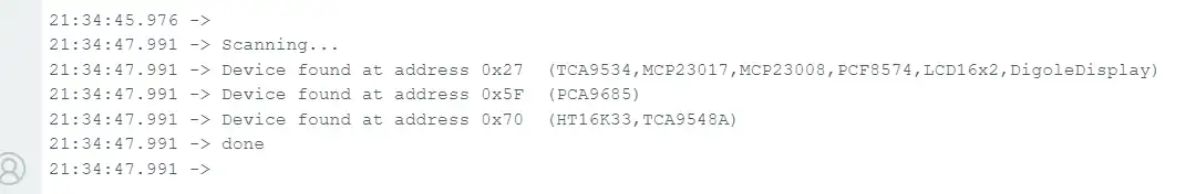 After adding a new component that is a part of the I2C network (PCA9685, TCA9534, MPL115A, EMG socket PCB), upload the I2C scanner from Wire library and run the scan to make sure that the recently added part is detected correctly. Refer to Software section for the libraries to be used.