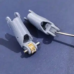 Use suitable glue to fix the wheel gear into the proximal unit, and use 4 mm x 19.5 mm shaft to secure the wheel gear in place while glue is curing
