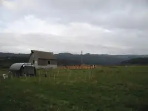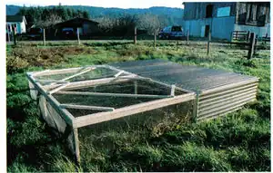 - Our first HH model didn't have a floor and despite moving the HH every few days the ground inside got too high a concentration of feces. We installed a new wire floor and tarps beneath collect the feces so that the ground underneath the HH didn't get too much wear. However the land just outside the entrance still received excessive fecal deposits and grazing. The rest of the enclosure was grazed and defecated on fairly evenly and recovers (with new lush growth) within a week or two of the chickens being moved off.