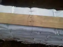 The roof of Bags of Shelter is made of polypropylene sheeting. The model size shelter requires 2 sheets cut to scale. These sheets are attached by screws or nails to rafters that are attached to the framework of the roof. The framework is made of 1"x6" Boards that are layed across the top most layers of the bags and secured on with wire. Figure 9 shows two holes which are drilled through the 1"x6" boards every four feet. The wire is wrapped through these holes and secured down underneath the top three layers of bags. The CAD drawing depicted above in Figure 3 shows a side view of the roof, which has a two foot slope and a one foot overhang in order to protect the structure from water damage.