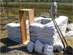The Rubble Trench Foundation that was tested by team Rubblution in cooperation with team Humangineers. Team Humangineers project used dirt as a resource to build relief structures out of soil-filled bags, and was called WorldShelters Bags of Shelter. These bags were placed directly on top of the trench and provided direct weight on top of the Rubble Trench Foundation. The trench was built to a half scale model for an 8' x 6' structure.