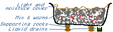 This system is similar to the bath system, except that its designed for continuous usage, a garden seat is constructed, about 2.5m on each side, and a metre high.This size would suit a 1000m2 site, such as an Australian suburban block. A metre cube in the middle, is filled with soil and a Zone 1 tree that will be very well fertilized. The seat is started with a mixture of scraps, compost and worms. The system generates castings continuously, scraps being added at one end, and fertilizer removed at the other end. The down-side is that you can't collect the liquid fertilizer seperately, it will soak into the soil - and fertilize the tree. The up-side is that, unlike an old bath, it makes an attractive feature in the garden.