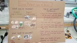 Fig 3: The educational posters were prototyped using cardboard. Information about decomposition and how to use the compost was put on the cardboard, and sent into classrooms at the middle school. This is the left-side bin poster prototype, which has information anbot things users can and cannot compost.