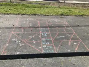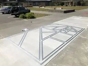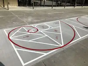 After showing our clients the alternative prototypes, we decided to conglomerate the separate solutions into one final design, naming it "The Fibogeometry".The team also decided to paint the final design, and create it in a way that is easily replicable through a series of stencils. The final design has three main rectangles which contain Fibonacci spirals. The middle rectangle is filled with various geometric shapes, and the corresponding equations to solve each. The two opposite rectangles have been left relatively blank, to allow students to experiment with shapes creatively through means of drawing with chalk on the concrete.