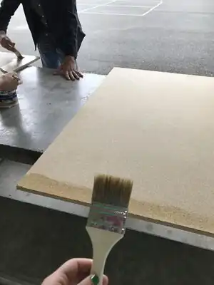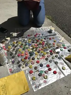 Spray paint bottle caps for violin design. Bottle caps were painted in order to cover up beer logos that are inappropriate for a middle school setting.