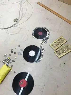 Plan out design of violin for side panels. Team Strange used old records, bottle caps, brass air vents, license plates, and recycled wood to create the violin.