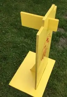 Gather two 3' x 3' sheets of MDP. First, cut a piece out using any saw that is 18" wide by 40" long. About a foot from the top, drill a pilot hole and use a jigsaw to cut out a rectangular hole measuring ¾" wide by 5" tall. This will be the body of the podium. Second, cut off two sections from one of the ends of the previous piece that measure 4" long by 2" tall, leaving a rectangle at that end. This is what the writing surface will slide onto. Next, cut a rectangle that measures 24" wide by 20" tall. This will be the base. Into this piece about 1" from the top, drill a pilot hole and then use a jigsaw to cut out a rectangular hole measuring ¾" tall and 18" long. This will be the hole into which the body will be inserted. Perpendicular to that hole, right down the center, cut another rectangular hole measuring ¾" wide by 6" long. This is where you will place the triangular body support.