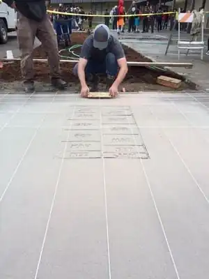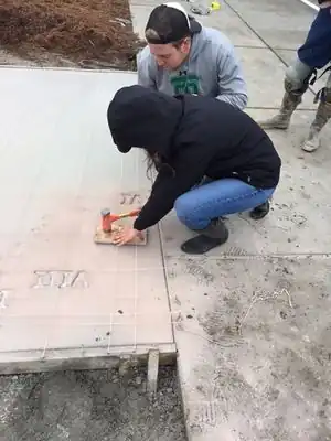 After the concrete has been poured and smoothed out, allow the concrete to cure for 30 to 45 minutes. Begin laying out center string lines.