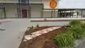 The tessellating concrete paths at Zane Middle school are placed in solely the rectangular site location. The triangular portion of the groundwork features a pathway of alternating red and white tiles to form a checkered pattern. Spaces have been left around the tiles for the placement of grass seed in order to secure the tiles. Smaller pieces of pavers are located at the edge of either end of the path. Three Cala lilies are contained within the triangular segment.