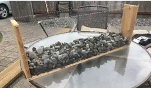 Build frame according to the measurements having two strong wooden pieces supporting the garden section. Screw the centerpiece at an angle allowing for the water to flow downwards. At the bottom end of the angled piece of wood drill a hole for drainage.