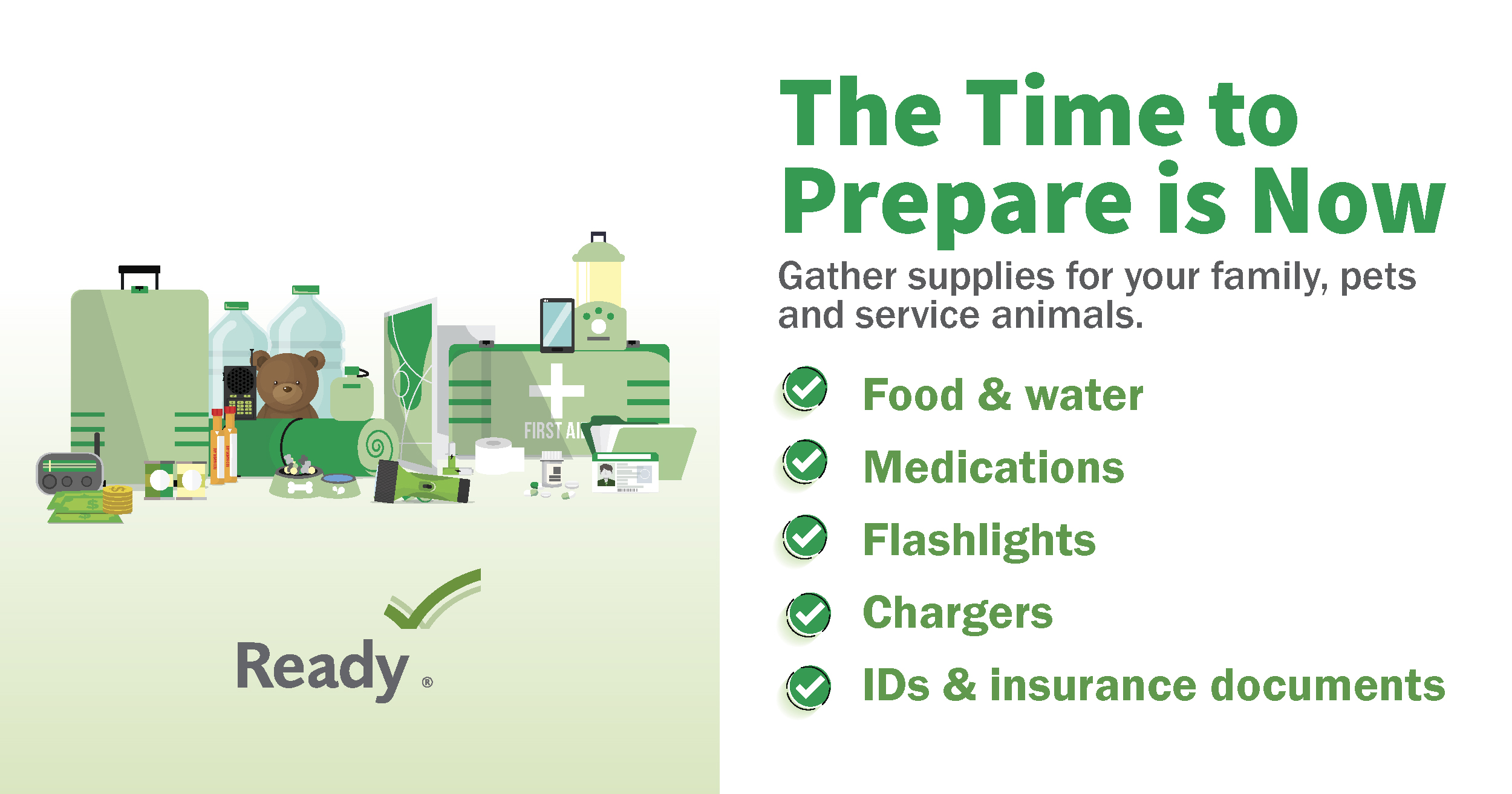 The Time to Prepare is Now. Gather Supplies for your family, pets and service animals. Supplies include food and water, medications, flashlights, chargers, ID and insurance documents.