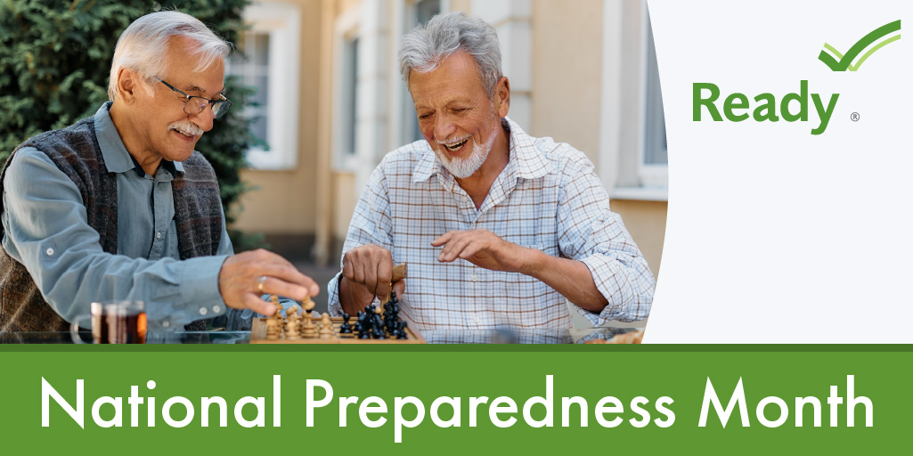 A group of older adults smiles with their hands together. National Preparedness Month.
